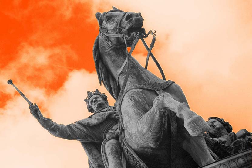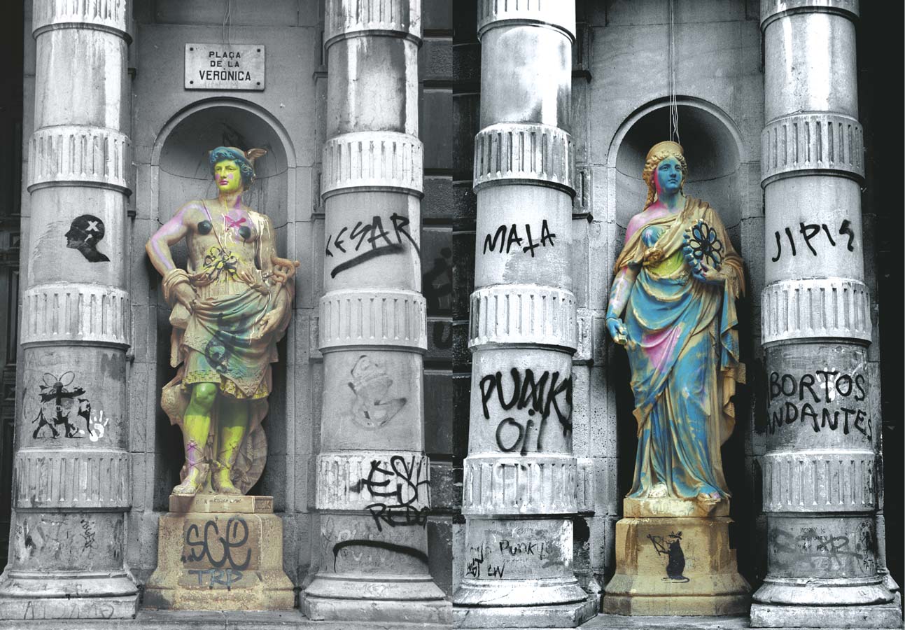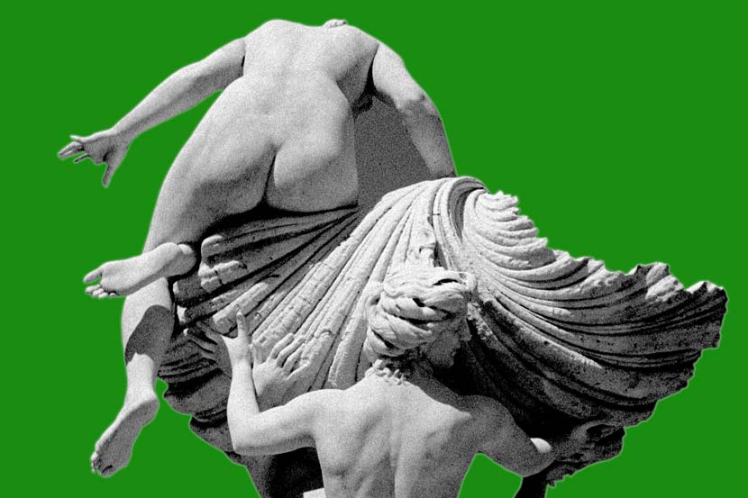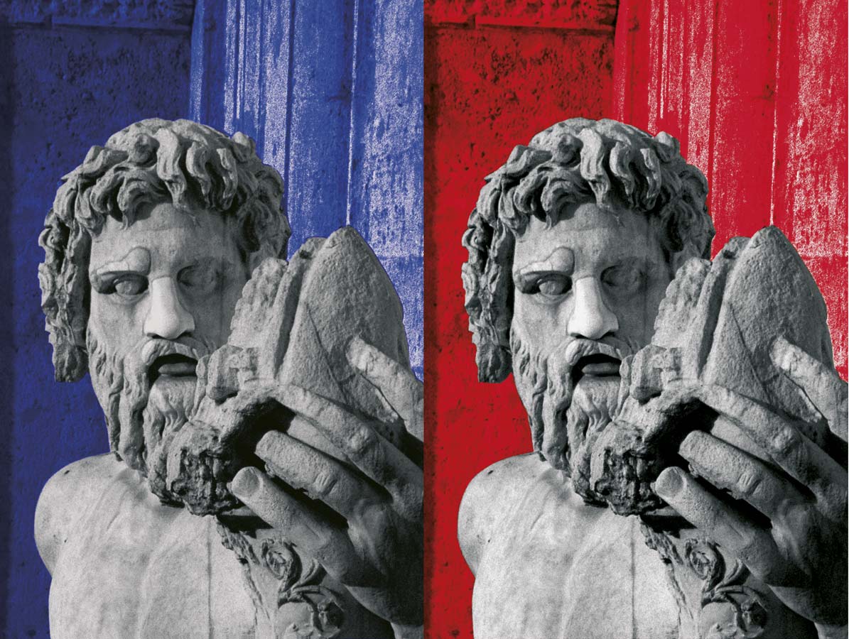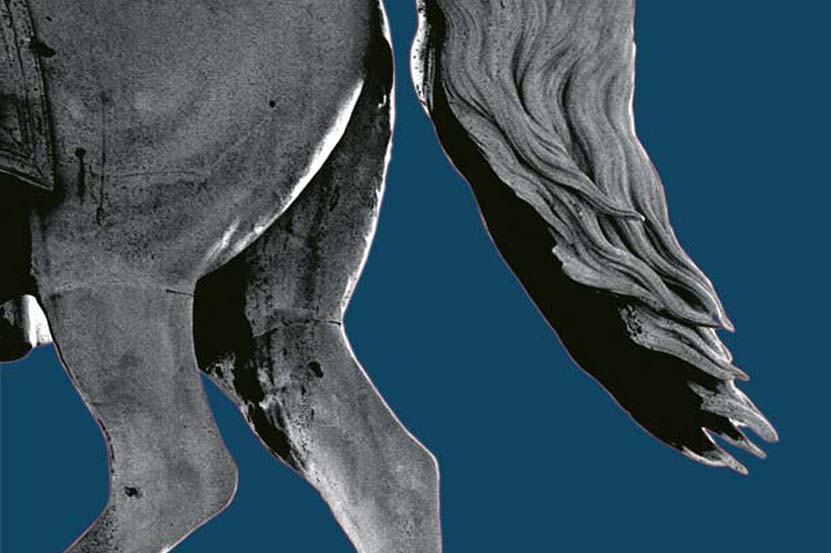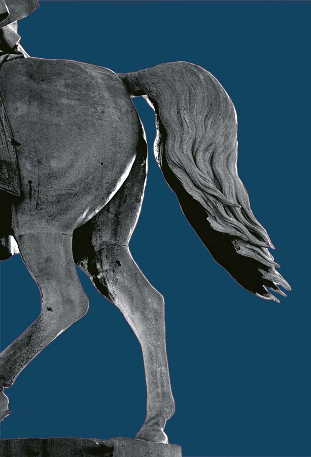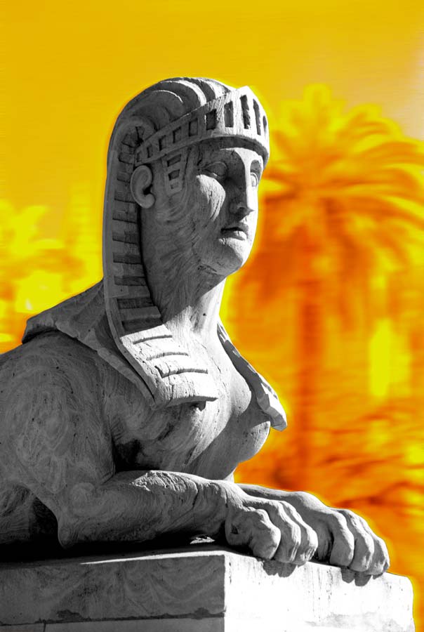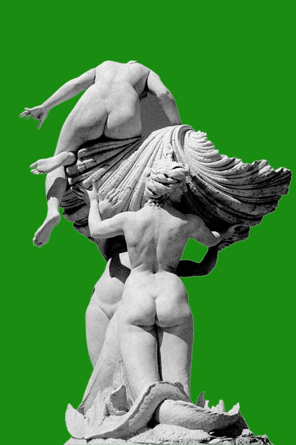 Statues always attracted me. I photographed them, but I never knew how to use the pictures. Then I had the feeling that putting them into an black & white abstraction and dyeing the background with impossible colours could be the solution. This is the result.